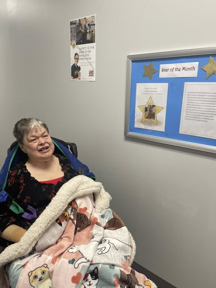 Cheryl enjoys working on peg boards and has learned to sort colors and create her own patterns. She also has a deep love for music and singing along to her favorite songs, which brings so much joy to everyone nearby. And when a dance party starts, Cheryl is the first to join in, especially if staff are dancing with her!